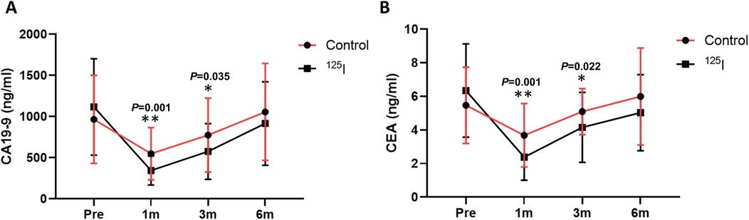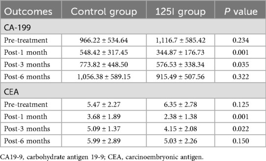 CA19-9 and CEA levels after operation are shown in Table 2. Compared with the preoperative CEA and CA19-9 levals, the follow-up values of the patients with increased CEA and CA19-9 values after 1 month of treatment all decreased to different degrees (Figures 4A,B). In addition, the CEA and CA19-9 levels of the 125I group at 1 and 3 months after operation were lower than those of the control group.