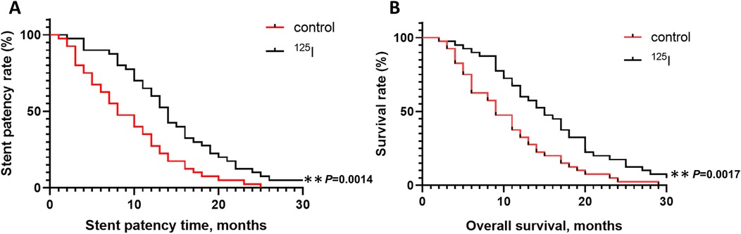 The patency conditions of the stents in the two groups are shown in Figure 5A. The cumulative patency rates of the control group at 3, 6, and 12 months were 92.5%, 67.5% and 35%, respectively, and the median patency time was 8 months. The cumulative patency rates of the 125I group at 3, 6, and 12 months were 97.5%, 90% and 65%, respectively, and the median patency time was 14 months. The hazard ratio (HR) for the 125I group compared to the control group was 0.446 (95% CI: 0.271, 0.732), indicating a statistically significant difference and significantly longer patency time in the 125I group. The postoperative survival data are shown in Figure 5B. The cumulative survival rates of the control group at 3, 6, and 12 months were 97.5%, 75% and 37.5%, respectively, and the median survival time was 9 months. The cumulative survival rates of the 125I group at 3, 6, and 12 months were 97.5%, 92.5% and 67.5%, respectively, and the median survival time was 15 months. The HR for the 125I group compared to the control group was 0.452 (95% CI: 0.275, 0.742), demonstrating a statistically significant difference and significantly longer survival time in the 125I group.