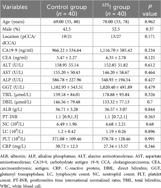 Forty advanced eCCA patients who received percutaneous transhepatic biliary stenting (PTBS) alone (control group) or 40 patients who received PTBS combined with 125I seed implantation (125I group) were included (Figure 2). The baseline clinical characteristics of these 80 patients are summarized in Table 1. In the control group, there were 17 males (42.5%) and 23 females (57.5%), and the mean age was 69.20 ± 6.90 years. Among them, 19 patients were were diagnosed with pCCA, and 21 patients were were diagnosed with dCCA. In the 125I group, there were 21 males (52.5%) and 19 females (47.5%), and the mean age was 69.33 ± 7.13 years. Among them, 13 patients were were were diagnosed with pCCA, and 27 patients were were diagnosed with dCCA. There were no significant differences in preoperative liver function, jaundice, or tumor markers between the two groups of patients (P > 0.05). A biliary stent or biliary stent combined with 125I particles was successfully implanted in both groups of patients, the biliary tract was unobstructed after operation, and the surgical success rate was 100%.