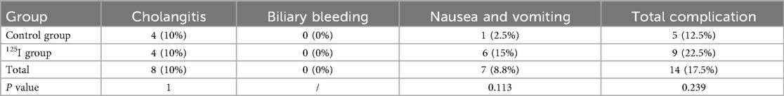 As shown in Table 3, the overall incidence of early complications was 17.5% (14 patients), with 12.5% (5 patients) and 22.5% (9 patients) in the control group and the 125I group, respectively. There was no significant difference in the total incidence between the two groups. Specifically, 4 patients in the control group and the 125I group both developed cholangitis, and no patients in the two groups developed bile duct bleeding. Gastrointestinal complications (nausea and vomiting) occurred in 1 patient in the control group and 6 patients in the 125I group, respectively, but there was no significant difference between the two groups. The symptoms of nausea and vomiting were mild and were gradually relieved.