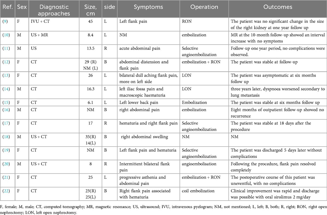 To better contextualize the clinical relevance of the present case, a systematic retrieval and synthesis of previously reported cases of giant TSC-associated RAML was performed (Table 1). The literature review included studies published up to April 2025. The search was conducted using the PubMed database with the following key terms: tuberous sclerosis complex, renal angiomyolipoma, diagnosis, treatment, and prognosis. Comparative analysis indicates that for tumors of this considerable size, particularly those complicated by rupture and hemorrhage, conventional management has predominantly relied on open nephrectomy or staged intervention following emergency embolization (9, 12, 21). This preference is largely attributable to concerns regarding intraoperative hemorrhage control and the challenges posed by severe adhesions in laparoscopic settings. Nonetheless, the successful outcome in this case provides valuable clinical insight into alternative approaches. Compared with the cases reported by Winterkorn and Kodati, direct laparoscopic nephrectomy in this instance obviated the risk of subsequent RAML enlargement and decreased the necessity for additional treatment (10, 22). Although the tumor size was similar to that documented by the Arachchi group (16.3 cm), the present procedure was completed entirely laparoscopically and did not require intensive care unit admission, underscoring the feasibility and safety of this approach when performed by a proficient surgical team (14). In contrast to the two-stage surgical strategy following embolization as described by Parekh and Bellouki (12, 21), the single-stage laparoscopic radical resection performed herein circumvented the risks associated with multiple interventions and delayed rebleeding, offering the patient a definitive “one-stop” therapeutic solution. The successful application of this technique, however, critically depends on meticulous preoperative evaluation, early control of the renal vasculature, and advanced laparoscopic operative skills.