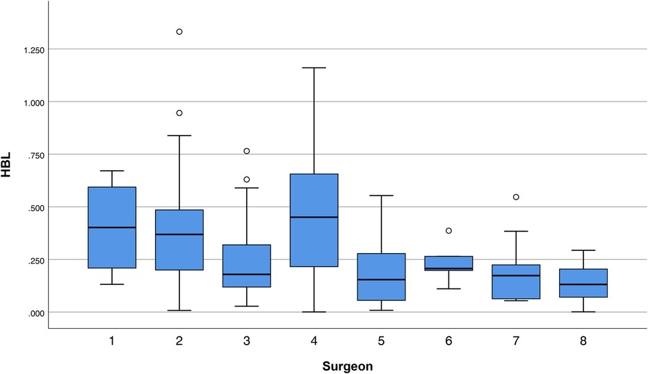 Statistical analysis was performed using SPSS 25.0. Continuous variables are presented as mean ± SD (with 95% CIs) or median (IQR); categorical variables as counts (%). Univariate analyses included Kruskal–Wallis tests (comparisons across surgeons/assistants) and Pearson correlations (relationships between quantitative variables). Multivariate stepwise linear regression identified independent predictors of HBL, including variables with p < 0.05 and Variance Inflation Factor (VIF) around 1.0 in univariate analysis. Statistical significance was set at p < 0.05.