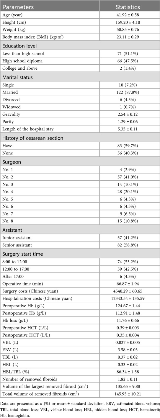 A total of 139 patients were included in this study, with demographic and surgical characteristics summarized as follows: the mean age was 41.92 ± 0.58 years (95% CI: 40.78–43.06), and the mean BMI was 23.11 ± 0.29 kg/m2 (95% CI: 22.54–23.68). Among the cohort, 40.3% had a history of cesarean section. The surgical sample was distributed across 8 attending gynecologists, with Surgeon No. 2 performing the largest proportion of procedures (n = 57, 41%), followed by Surgeon No.5 (n = 15, 10.8%) and others (range: 4.3%–8.6%). Most surgeries (53.2%) were conducted between 8:00–12:00, with only 4.3% starting after 17:00 (Table 1).