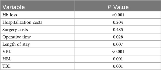 (1) Estimated blood volume (EBV) via Nadler's equation for females: EBV(L) = 0.3561 × height(m)3 + 0.03308 × weight(kg) + 0.1833; (2) Total blood loss (TBL) via Gross's formula: TBL = EBV × (HCTpre—HCTpost)/HCTave, where HCTpre is preoperative HCT (measured within 24 h preoperatively), HCTpost is postoperative day 2 HCT, and HCTave is the average of HCTpre and HCTpost; (3) HBL = TBL—VBL. Without post-operative drainage, the VBL is approximately equal to the intraoperative bleeding (13–15).