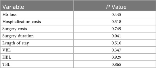 In terms of blood loss outcomes, the mean preoperative hemoglobin (Hb) was 124.67 ± 1.44 g/L (95% CI: 121.83–127.51), which decreased to 112.9 ± 1.48 g/L (95% CI: 110.0–115.8) postoperatively, resulting in a perioperative Hb loss of 11.76 ± 0.66 g/L (95% CI: 10.46–13.06). Preoperative anemia (Hb < 120 g/L) was observed in 29.5% of patients (n = 41), and this proportion increased to 59.7% (n = 83) postoperatively. The mean visible blood loss (VBL) was 0.037 ± 0.005 L (95% CI: 0.027–0.047), while the mean hidden blood loss (HBL) was 0.33 ± 0.02 L (95% CI: 0.29–0.37), accounting for 86.3% of total blood loss (TBL; 95% CI: 83.2–89.5%).