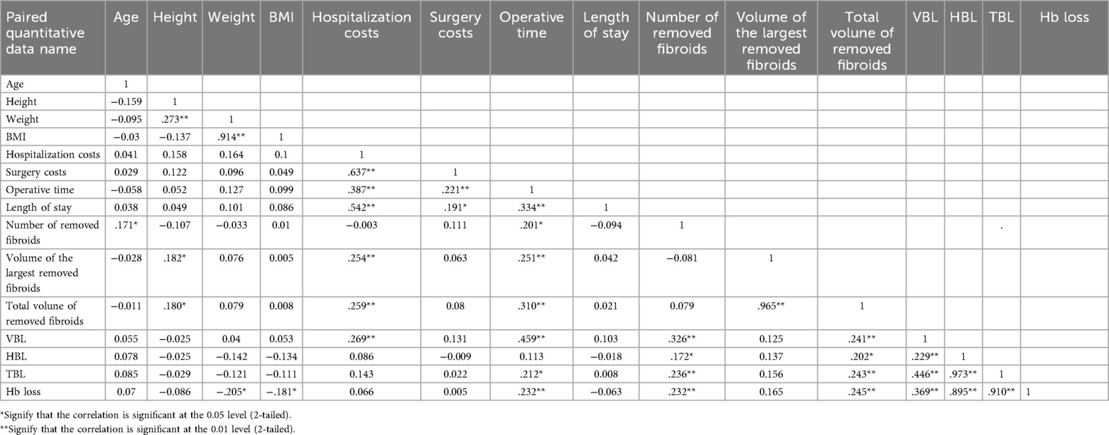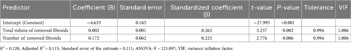 Pearson correlation analysis demonstrated that HBL was positively associated with the number of removed fibroids (r = 0.172, p < 0.05) and total fibroid volume (r = 0.202, p < 0.05; Table 5). Multivariate regression further confirmed total fibroid volume (β = 0.002, p = 0.002) and the number of fibroids (β = 0.172, p = 0.006) as independent predictors of log-transformed HBL (Table 6).