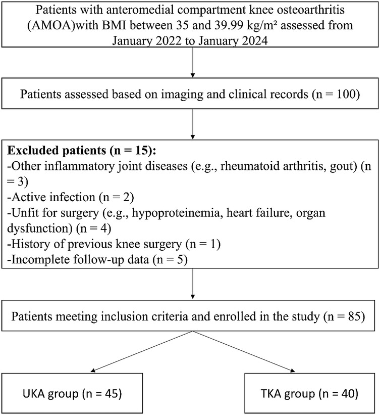 Figure 1. Case selection process of this retrospective study. Among 100 patients with anteromedial compartment knee osteoarthritis (AMOA) and BMI between 35 and 39.99 kg/m2 assessed between January 2022 and January 2024, 85 patients met the inclusion criteria and were divided into two groups based on the surgical procedure received.