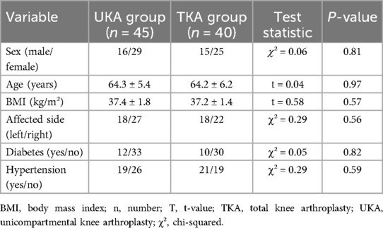 A total of 85 obese patients were included in this study and divided into two groups according to the type of surgery received. The UKA group consisted of 45 patients (16 males, 29 females), aged 52–74 years, with a mean age of 64.28 ± 5.44 years and a mean BMI of 37.68 ± 8.22 kg/m². The TKA group included 40 patients (15 males, 25 females) aged 54–75 years, with a mean age of 64.23 ± 6.23 years and a mean BMI of 37.23 ± 1.36 kg/m². There were no statistically significant differences in baseline characteristics between the two groups (P > 0.05, Table 1).