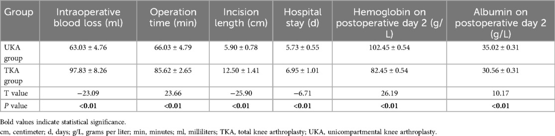 The UKA group showed significantly better outcomes in several perioperative indicators compared to the TKA group, including less intraoperative blood loss, shorter operative time, smaller incision length, shorter hospital stay, and significantly higher hemoglobin and albumin levels on postoperative day 2 (all P < 0.05, Table 2). These findings suggest that UKA is associated with less surgical trauma, reduced metabolic stress, and faster postoperative recovery.