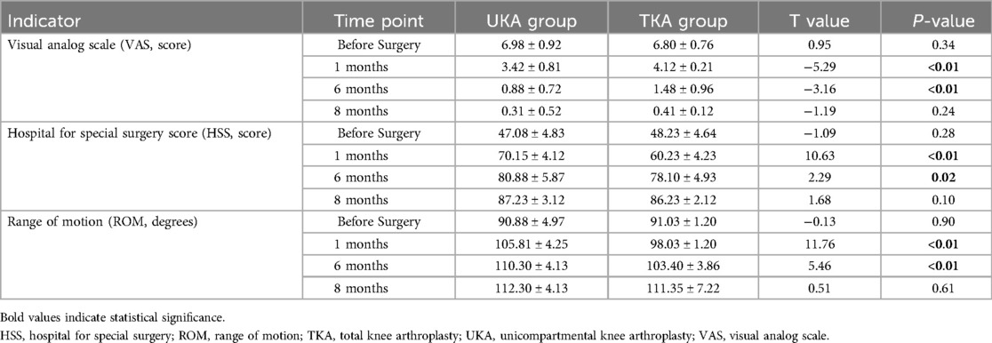 All patients successfully completed their surgeries, and postoperative imaging confirmed satisfactory prosthesis positioning and stability. The mean follow-up duration was 10.45 ± 1.98 months (range: 9–12 months) in the UKA group and 10.98 ± 1.98 months (range: 8–12 months) in the TKA group. In terms of complications, only one case of deep vein thrombosis (DVT) occurred in the UKA group (2.22%), while the TKA group reported seven complications: two cases of DVT, one superficial wound infection, three cases of fat liquefaction at the incision site, and one case of delayed wound healing, with a total complication rate of 17.5% (P < 0.05). There were no significant differences in VAS, HSS scores, or ROM between the two groups preoperatively (P > 0.05). At 1 and 6 months postoperatively, the UKA group showed significantly lower VAS scores (P < 0.01) and significantly higher HSS scores and ROM (P < 0.05), indicating superior early pain relief and functional recovery. However, by the 8th postoperative month, no significant differences were observed between the groups in these metrics (P > 0.05, Table 3).
