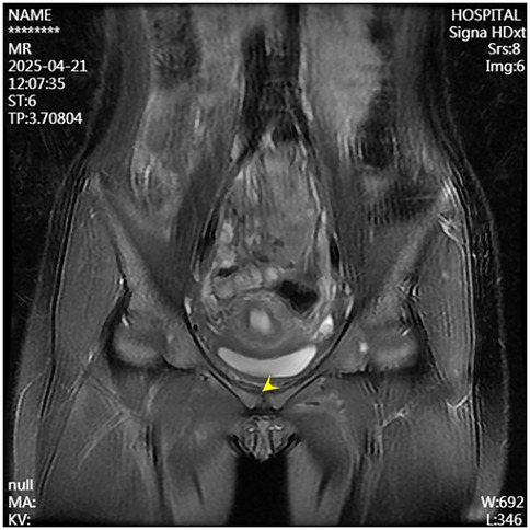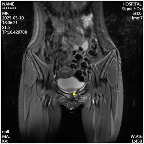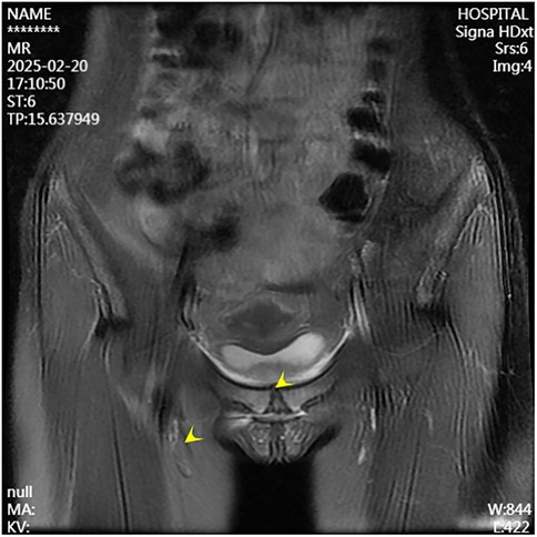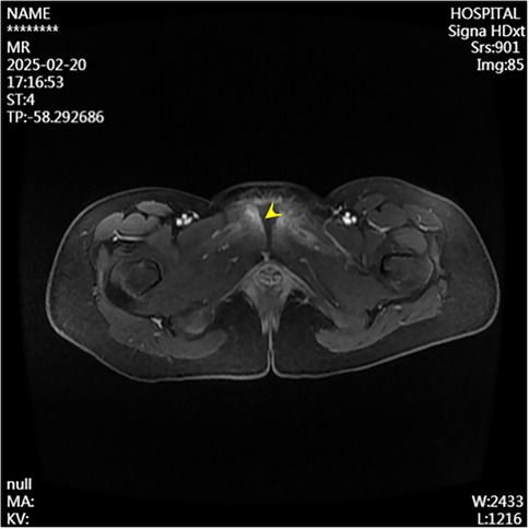 A 13-year-old female presented to the Department of Pediatrics at Dongguan Maternal and Child Health Hospital with a 10-day history of intermittent fever and pain in the pubic symphysis region. The patient denied a history of pelvic surgery, local trauma, or strenuous exercise. Her past medical and family histories were unremarkable. Between February 10 and 18, 2025, she was hospitalized at an external institution due to pubic symphysis pain, restricted lower limb mobility, and high fever. Blood cultures identified the presence of methicillin-resistant Staphylococcus aureus (MRSA) and she was treated initially with cephalosporins and penicillins which resolved the fever but only partially alleviated the pubic pain. Upon transfer to our hospital, physical examination revealed stable vital signs, no fever, localized tenderness and swelling over the pubic symphysis without erythema or fluctuance, bilateral restricted hip motion (aggravated by adduction and abduction), and an antalgic gait. The laboratory findings included a white blood cell count of 6.08 × 109/L (neutrophils: 64.0%), procalcitonin <0.1 ng/ml, and an erythrocyte sedimentation rate (ESR) of 80 mm/h. Blood cultures confirmed the presence of MRSA. Although intravenous antibiotics had resolved the fever, pubic pain and mobility limitations persisted, particularly with limited hip mobility, notably painful external rotation and adduction, where external rotation was less than 15 degrees and adduction was less than 10 degrees. Consultation with orthopedic specialists led to the suspicion of pubic symphysis infection, prompting an MRI examination. The imaging revealed infection of the pubic symphysis with bilateral osteomyelitis and a small abscess in the posteroinferior muscle layer (Figures 1, 2). Based on these clinical manifestations, laboratory results, and imaging findings, the diagnosis was confirmed as pubic symphysis infection with bilateral osteomyelitis and abscess formation.