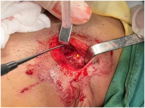 Figure 3. Intraoperative view: fibrous tissue of the pubic symphysis with purulent changes, and pus observed within the medullary cavities of bilateral superior pubic rami.