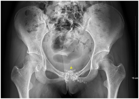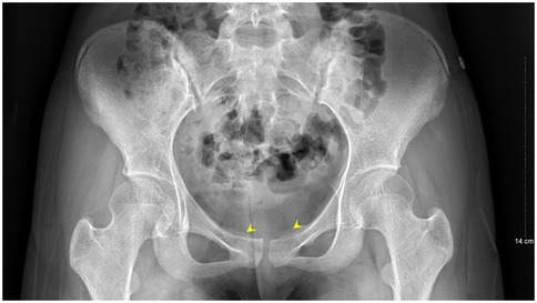 We reviewed the patient's clinical records, imaging findings, bacteriological data, and postoperative recovery, and conducted a comprehensive literature search.Based on established search strategies from prior studies (2), a comprehensive literature review of pediatric and adolescent pubic symphysis infections was conducted. This involved the searching of the PubMed, Wanfang, China National Knowledge Infrastructure (CNKI), VIP, and China Biology Medicine (CBM) databases for articles published from database inception to April 2025. The English search terms included “osteomyelitis pubic symphysis”, “septic arthritis pubic symphysis”, “pubic symphysitis”, “pubic osteitis”, and “pubic infection”, while Chinese keywords were “耻骨联合感染” (pubic symphysis infection), “耻骨联合化脓性感染” (suppurative pubic symphysis infection), “耻骨联合炎症” (pubic symphysis inflammation), “耻骨骨髓炎” (pubic osteomyelitis), “耻骨感染” (pubic infection), and “耻骨炎症” (pubic inflammation). The criteria for article inclusion in the analysis were: (1) patients aged ≤18 years; (2) confirmed diagnosis of pubic symphysis infection. The exclusion criteria were: (1) cases with ambiguous diagnoses; (2) studies lacking sufficient clinical data for analysis.