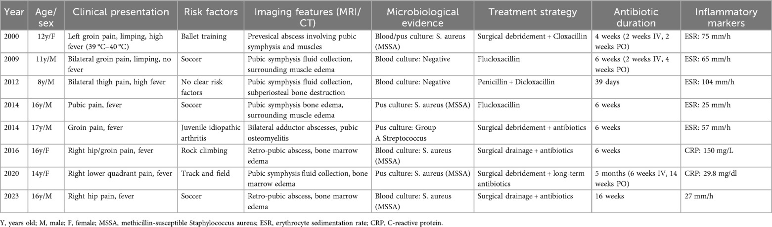 After the exclusion of studies on infections not associated with the pubic symphysis, 9 articles on pediatric infections of the pubic symphysis were identified. One of these was excluded due to inaccessible data from an outdated publication, resulting in 8 eligible case reports published in English (3). Of these, Lorenzo et al. (4) described a 12-year-old child with fever (39–40°C), abnormal gait, and left groin pain; pelvic computed tomography (CT) indicated a pubic symphysis-adjacent abscess, with Staphylococcus aureus identified on aspiration culture. The case was managed by surgical debridement and four weeks of antibiotics, resulting in the complete resolution of symptoms by six months (4) Hartshorn et al. (5) reported an 11-year-old with bilateral groin pain, difficulty in walking, and nocturnal enuresis. The child was diagnosed via MRI (pubic symphysis fluid) at four weeks and was treated with intravenous flucloxacillin/cefuroxime for two weeks, followed by oral antibiotics for four weeks (5). Ming-Yen Tsai et al. (6) documented an 8-year-old with bilateral thigh pain and fever; MRI at two days showed the presence of pubic symphysis fluid, osteolysis, and soft tissue edema. The patient was treated with intravenous oxacillin and oral rifampin/dicloxacillin for 39 days (6). Imane El Mezouar et al. (1) described the case of a 16-year-old with fever, pubic/genital pain, and limping; MRI confirmed edema of the pubic symphysis/rectus abdominis, and cultures indicated the presence of methicillin-sensitive S. aureus (MSSA). The patient was managed with six weeks of intravenous and four weeks of oral flucloxacillin (1) Alqahtani et al. (7). described a 17-year-old with groin pain, chills, and fever; MRI at three weeks revealed pubic osteomyelitis and thigh abscesses (Group A Streptococcus), which was treated surgically followed by six weeks of intravenous antibiotics (7). A 16-year-old patient was described by Smits et al. (8) as experiencing hip/groin pain and fever; MRI at five days showed para-pubic edema/abscess (S. aureus on blood culture), and the patient was treated with surgical/image-guided drainage and six weeks of antibiotics (8) Upadhyayula (9). presented the case of a 14-year-old with suprapubic pain/fever; MR enterography demonstrated septic arthritis of the pubic symphysis with cellulitis/abscess caused by MSSA, which was treated by surgical drainage, antibiotics (six weeks intravenous and 14 weeks oral), and steroids for five months (9) Kim et al. (10). described the case of a 16-year-old who did not respond to six weeks of conservative antibiotic treatment, requiring surgery after 16 weeks of therapy, as described in Table 1 (10).