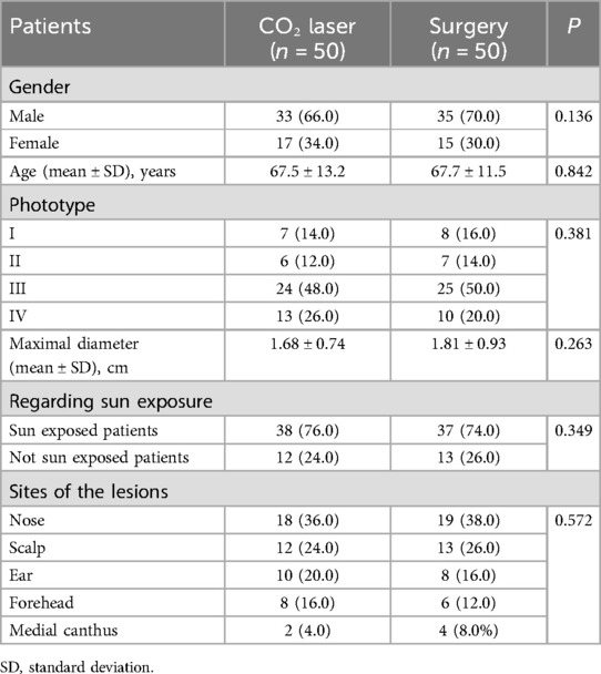 In the CO₂ laser group of 50 patients, 66.0% (33 cases) were male and 34.0% (17 cases) were female, with an average age of 67.5 ± 13.2 years. In the surgical group, 70.0% (35 cases) were male and 30.0% (15 cases) were female, with an average age of 67.7 ± 11.5 years. The maximum diameter of the lesions in the CO₂ laser group was 1.68 ± 0.74 cm, while in the surgical group it was 1.81 ± 0.93 cm. In the CO₂ laser group, 76.0% (38 cases) were patients with sun exposure, compared to 74.0% (37 cases) in the surgical group. Statistical analysis showed no significant differences in baseline data between the two groups (P > 0.05), indicating comparability, as shown in Table 1.