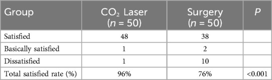 The surgical satisfaction rate in the CO₂ laser group was 96.0% (48/50), significantly higher than the surgical group's satisfaction rate of 76.0% (38/50). The difference was statistically significant (P < 0.001), as presented in Table 5 and Figure 1.