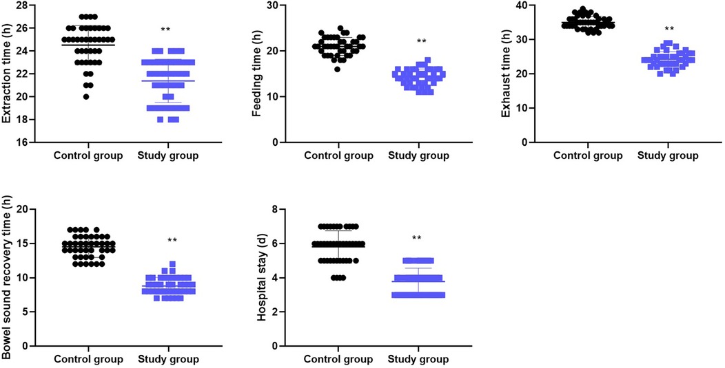 As shown in Figure 1, the study group presented significantly shorter extraction time, feeding time, exhaust time, bowel sound recovery time, and hospital stay compared to the control group (all P < 0.001).