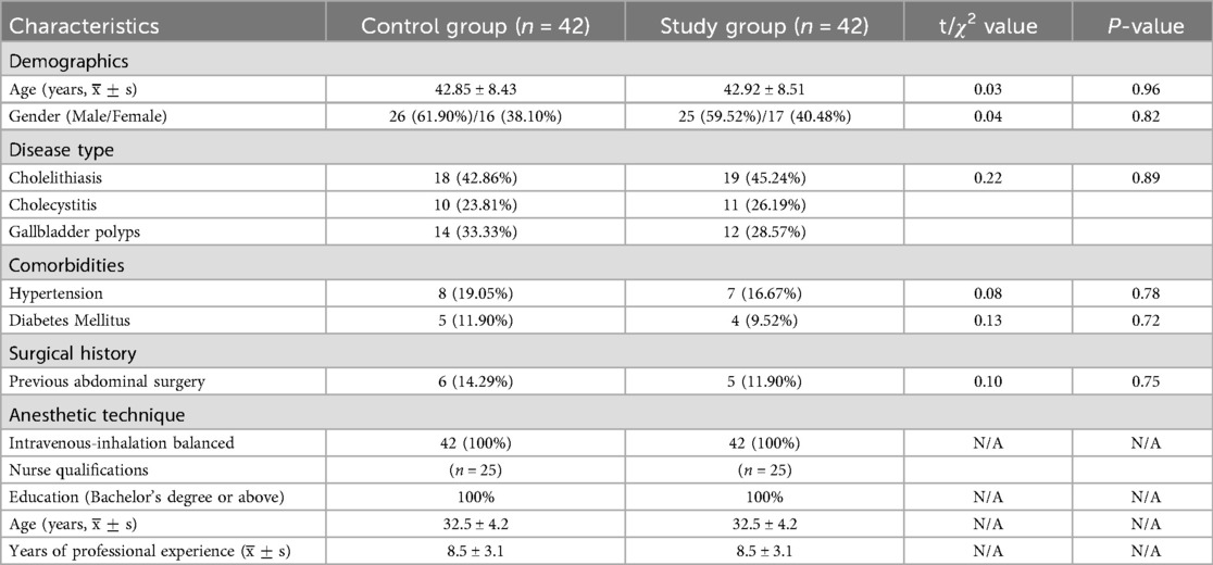 As detailed in Table 1, the two groups were well-matched at baseline. There were no statistically significant differences in demographic characteristics (age, gender), clinical profiles (types of gallbladder disease, prevalence of hypertension or diabetes mellitus), or surgical history (previous abdominal surgery). All patients in both groups received the same balanced intravenous-inhalation anesthetic technique. Furthermore, as outlined in the table, the qualifications of the nursing staff responsible for both groups were equivalent, ensuring that any observed differences in outcomes could be attributed to the nursing intervention itself rather than to disparities in patient baseline status or nursing expertise.