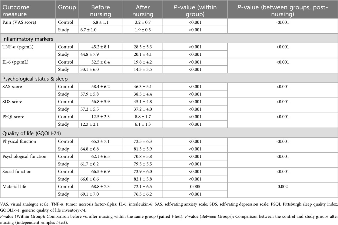 Before nursing, the serum levels of inflammatory mediators showed no difference between the two groups. Following nursing, the serum levels of TNF-α and IL-6 declined significantly in both groups, and the levels in the study group were significantly lower than those in the control group (P < 0.001 for both, Table 2).