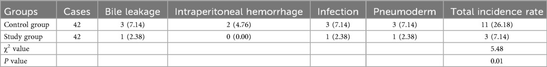 In comparison with the control group (11/42, 26.18%), the study group presented lower incidence of postoperative complications (3/42, 7.14%) (P = 0.018, Table 3).