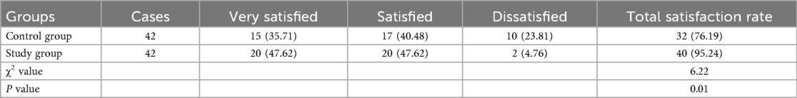 In comparison with the control group (32/42, 76.19%), the study group presented higher nursing satisfaction (40/42, 95.42%) (P = 0.013, Table 4).