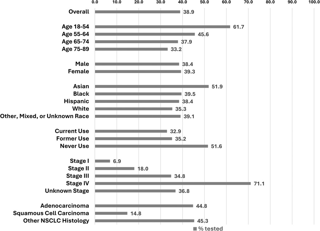 Results: Among 8,267 NSCLC patients, 38.9% received biomarker testing. Testing prevalence increased with disease stage: I (6.9%), II (18.0%), III (34.8%), IV (71.1%). Testing was more prevalent in patients aged <65 years, of Asian race, and who never smoked, lived in less deprived neighborhoods, and had non-squamous tumors. Younger age, never smoking, Asian race, and stage IV disease were independent predictors of biomarker testing. NGS vs. no testing was associated with 13% decreases in 3-year all-cause mortality.