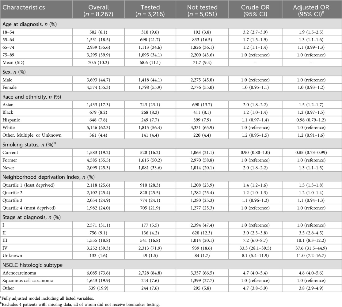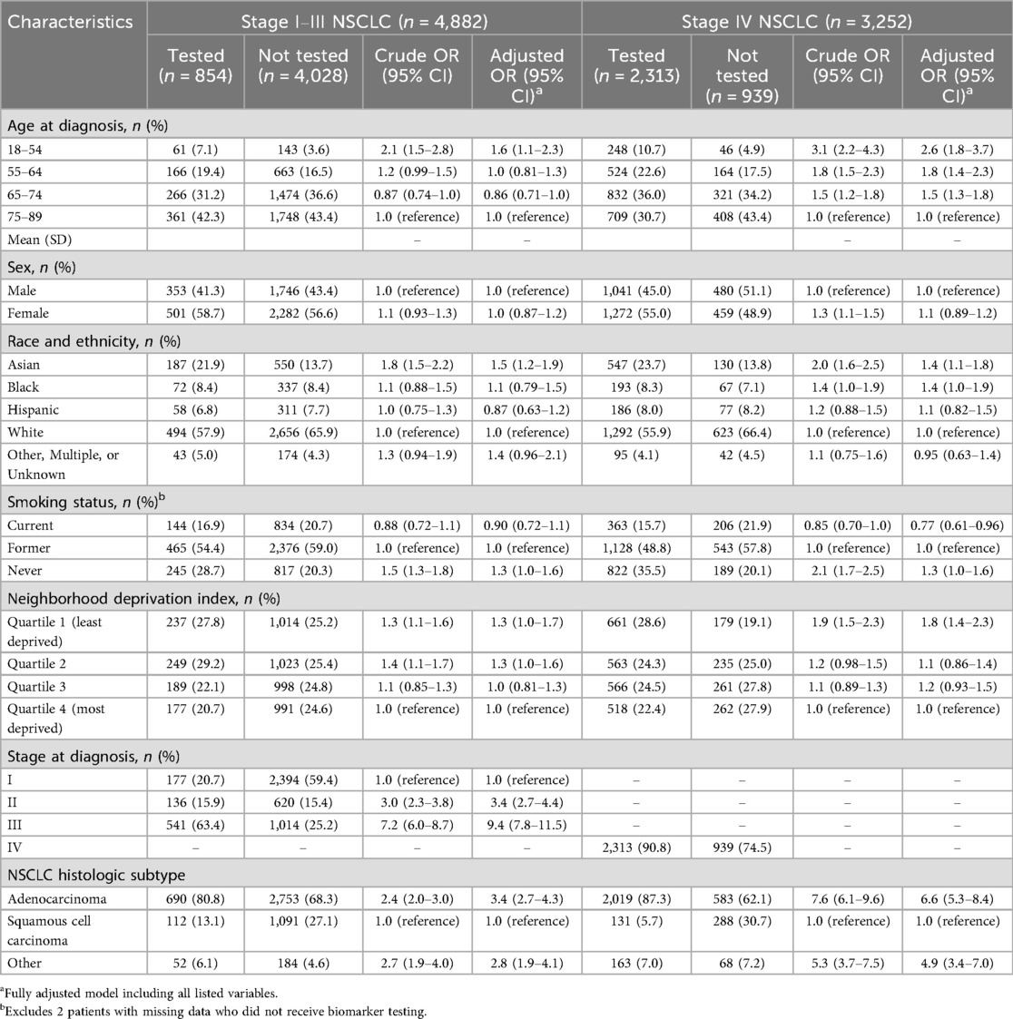 Table 2. Baseline demographic and clinical characteristics associated with biomarker testing status in patients with primary NSCLC by stage.