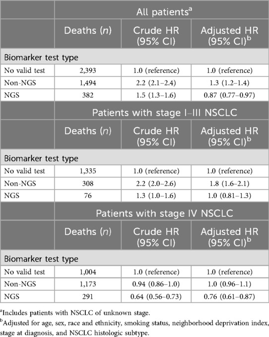 Table 3. All-Cause mortality associated with biomarker test type in patients with primary NSCLC, overall and by stage.