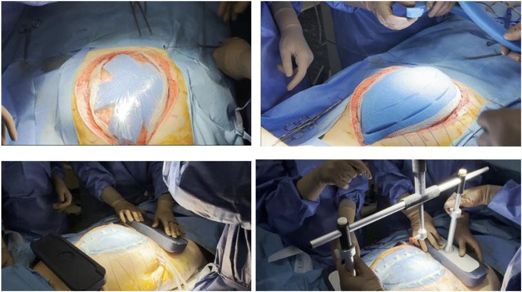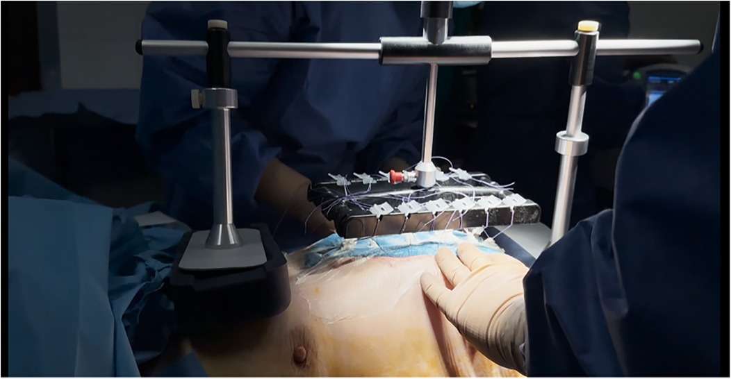 The pressure was maintained at 7–8 Newtons. Vertical traction was employed in cases of ACS or when primary closure was not feasible. Once edema subsided and visceral protrusion diminished, diagonal traction was applied to achieve myofascial elongation via lateral abdominal wall stretching, thereby facilitating fascial approximation and closure (18). The integrated device scale enabled quantifiable and reproducible traction adjustments tailored to individual anatomy.