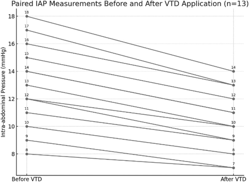 Intra-abdominal pressure (IAP) was systematically measured in all 13 patients prior to and following VTD placement. The mean IAP decreased from 12.8 ± 3.2 mmHg before device application to 10.1 ± 2.7 mmHg afterward (p = 0.06), suggesting a consistent trend toward improved abdominal compliance. Individual patient values and relevant paired trends in intra-abdominal pressure before and after application of the system are illustrated in Figure 3. No patient developed clinically relevant abdominal compartment syndrome after VTD application. Surrogate clinical markers, including preserved urine output, stable ventilatory parameters, and the absence of escalating vasopressor requirements, further supported the safety of the device. This finding indicates that the VTD does not increase intra-abdominal pressure during open abdomen management and may contribute to modest decompression in certain cases, thereby supporting its safety in maintaining physiologic IAP levels. The bar chart can be found in Figure 4.