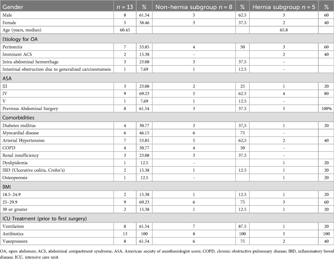 In our clinic, the vertical traction device was used in 13 patients over the past 24 months, including 5 women and 8 men, with a mean age of 58,8 years and a median age was 60.5. In 8 of the 13 patients, the indication for an open abdomen was peritonitis, in 3 cases intra-abdominal hemorrhage, in 2 cases ACS and in 1 case bowel obstruction due to generalized carcinomatosis. The etiologies of peritonitis in our case series included anastomotic leakage, such as leakage at the suture line of a small bowel anastomosis following prior surgery for intestinal obstruction (enterotomy for bezoar). Additional causes were peritonitis secondary to stoma retraction after total colectomy with end stoma formation and anastomotic leakage following intestinal repair in the context of trauma (gunshot injury). Baseline demographic and clinical characteristics of the study population are summarized in Table 1, which also allows for direct comparison between the hernia and non-hernia subgroups and provides essential context for interpreting the study results.