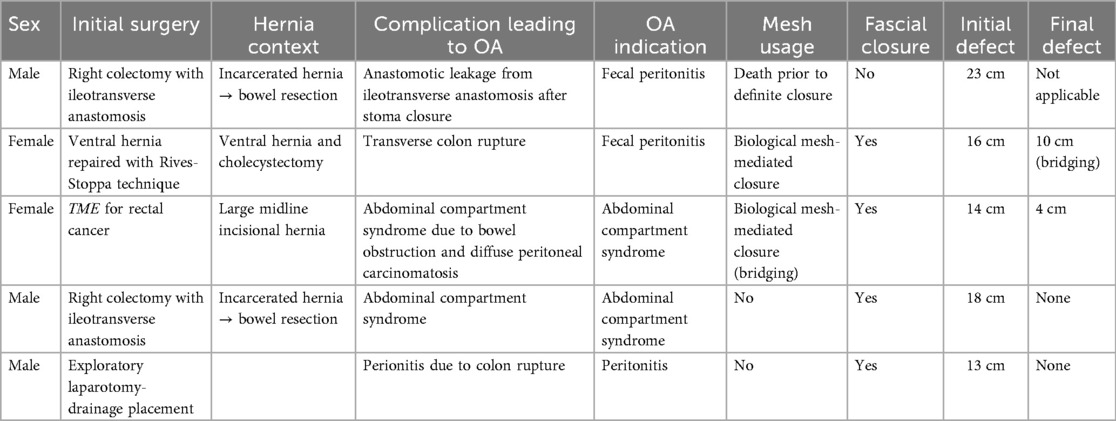 In our series, five patients had a pre-existing abdominal wall hernia at the time of their initial surgical intervention. All five developed major postoperative complications necessitating the use of the vertical fascial traction device for OA management. In all cases, the vertical fascial traction device was applied during OA treatment, demonstrating feasibility even in patients with a complex abdominal wall history. These cases underline the increased risk of postoperative complications in patients with hernia-related surgeries, and highlight the potential utility of traction-assisted fascial closure in this high-risk subgroup. This subgroup analysis can be found in Table 2.