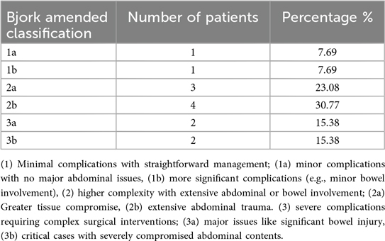 To further characterize the complexity of our cohort, patients were categorized according to the Björk Amended Classification (Table 3) (21). This classification system provides a standardized framework for assessing the severity of open abdomen cases. Notably, in patients classified as ‘frozen abdomen,’ the application of NPWT was particularly beneficial, as it compartmentalized the peritoneum from other intra-abdominal organs, limited dense adhesions, and facilitated safer surgical management.