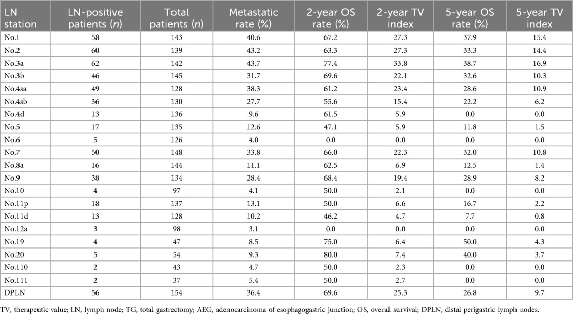 Based on clinicopathological data from TG patients, the metastatic rates and the therapeutic value (TV) indexes for DPLN were calculated, and risk factors for DPLN metastasis were analyzed. The TV index, proposed by Sasako et al. (13), estimates the benefit of LN resection by multiplying the metastatic rate of each LN station by the 5-year (or 2-year in this study) overall survival (OS) rate of patients with positive LNs at that station. The metastatic rate and the OS rate of patients with positive LNs were calculated independently for each LN station, regardless of metastasis to other LN stations and without any reference to the overall pathological nodal stage (13–15).