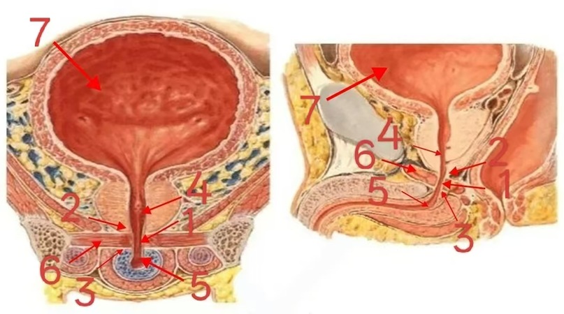 To provide a more intuitive understanding of the location of the membranous urethra within the urinary system and the key points of operation during laparoscopic radical prostatectomy, the urethral anatomical diagram (Figure 1) clearly shows that the membranous urethra (labeled 1) is situated between the apex of the prostate (labeled 2) and the urogenital diaphragm (labeled 3). It serves as the transitional region between the prostatic urethra (labeled 4) and the spongy urethra (labeled 5). The lumen of the membranous urethra is narrow, and it is surrounded by the sphincter of the membranous urethra (labeled 6), which is composed of striated muscle and plays a crucial role in maintaining the closed state of the urethra. The apex of the prostate is closely connected to the membranous urethra, and its anatomical structure is complex. During surgery, accurate identification and manipulation of this area are essential for preserving the length of the membranous urethra and protecting structures related to urinary continence. The bladder (labeled 7), located superior to the urethra, connects to the urethra through the internal urethral orifice. During urination, the coordinated contraction of the detrusor muscle of the bladder and relaxation of the urethral sphincter enable the expulsion of urine.