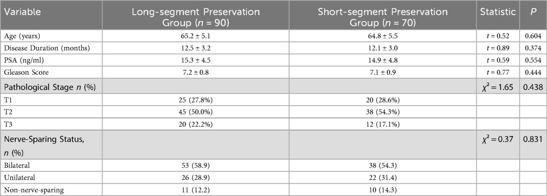 A total of 160 eligible patients were included in this study and divided into the long-segment preservation group (n = 90) and short-segment preservation group (n = 70) based on the preserved length of the membranous urethra. Comparative analysis demonstrated homogeneous baseline characteristics between cohorts (Table 1), with no significant differences in demographic parameters (age: P = 0.604), oncological profiles (PSA: P = 0.554; Gleason score: P = 0.444; pathological stage: P = 0.438), or nerve-sparing approaches (bilateral/unilateral/non-nerve-sparing: P = 0.831). This methodological equivalence minimizes confounding bias for subsequent continence outcome analyses.
