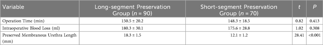 Mean intraoperative blood loss was 180.3 ± 30.1 ml in the long-segment preservation group and 175.6 ± 28.8 ml in the short-segment preservation group, with no significant difference (t = 1.02, P = 0.308). This indicates that varying membranous urethra preservation lengths did not lead to notable differences in blood loss, which may be more correlated with hemostatic measures, vascular ligation efficacy, and patient coagulation function.