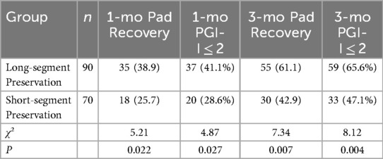 Early postoperative urinary continence recovery is detailed in Table 3. At 1 month, the long-segment group demonstrated significantly higher pad-based recovery rates (38.9% vs. 25.7%; χ² = 5.21, P = 0.022) and PGI-I meaningful improvement rates (41.1% vs. 28.6%; χ² = 4.87, P = 0.027) compared to the short-segment group. By 3 months, both metrics remained superior in the long-segment cohort (pad-based: 61.1% vs. 42.9%, χ² = 7.34, P = 0.007; PGI-I: 65.6% vs. 47.1%, χ² = 8.12, P = 0.004).
