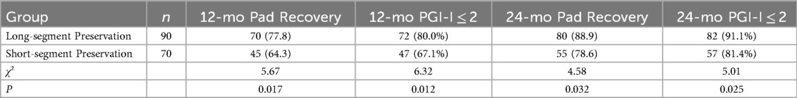 Long-term urinary continence outcomes are detailed in Table 4. At 12 months, the long-segment group demonstrated significantly higher pad-based recovery rates (77.8% vs. 64.3%; χ² = 5.67, P = 0.017) and PGI-I meaningful improvement rates (80.0% vs. 67.1%; χ² = 6.32, P = 0.012). By 24 months, both metrics remained superior in the long-segment cohort (pad-based: 88.9% vs. 78.6%, χ² = 4.58, P = 0.032; PGI-I: 91.1% vs. 81.4%, χ² = 5.01, P = 0.025). These results confirm that extended membranous urethral preservation sustains long-term continence benefits through both objective and patient-reported measures.
