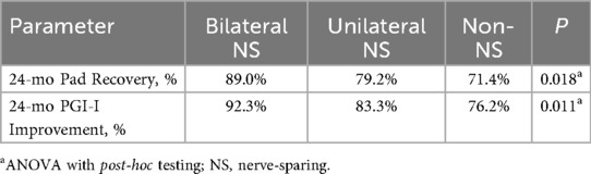 Subgroup analysis stratified by nerve-sparing approach revealed significant differences in 24-month continence outcomes (Table 5). For pad-based recovery, bilateral nerve-sparing yielded the highest recovery rate (89.0%), followed by unilateral (79.2%) and non-nerve-sparing (71.4%) (P = 0.018). Similarly, PGI-I meaningful improvement rates were 92.3% for bilateral, 83.3% for unilateral, and 76.2% for non-nerve-sparing (P = 0.011). Post-hoc analyses confirmed stepwise improvements: bilateral > unilateral > non-nerve-sparing (all P < 0.05). Patients receiving bilateral nerve-sparing with long urethral preservation (≥15 mm) achieved optimal outcomes (pad recovery: 94.3%; PGI-I improvement: 96.2%).