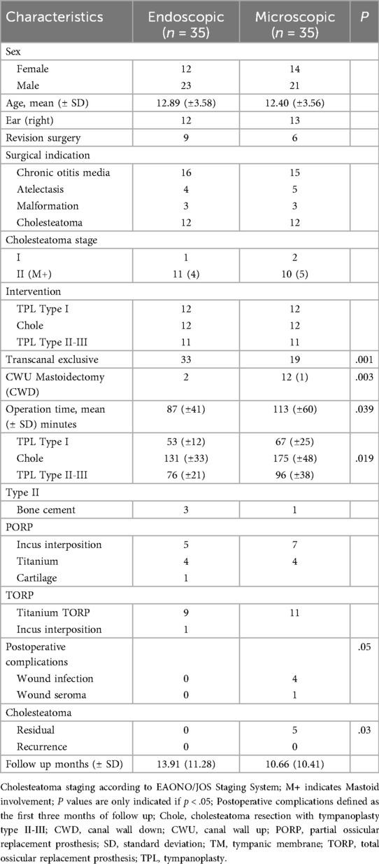 In this retrospective case-control study we matched a total of 70 consecutive endoscopic and microscopic TPL type I–III. The patients' age ranged from 4 to 17 with a mean age of 12.89 years (SD ± 3.58) in the endoscopic and 12.40 years (±3.56) in the microscopic group. The patient's characteristics are summarized in Table 1. COM was the primary surgical indication in both groups, with 16 cases in the endoscopic and 15 in the microscopic group. Cholesteatoma was found in an additional 12 cases per group. Other indications included conductive hearing loss due to atelectasis or malformation of the ossicular chain with intact footplate mobility. Nine endoscopic and six microscopic cases were revision surgeries due to persistent or recurrent disease.