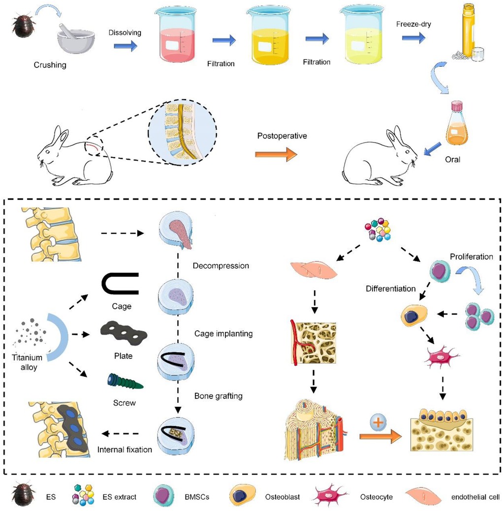 In recent years, with the development of bone tissue engineering (BTE), an increasing number of researchers have begun to analyze various bioactive components which are derived from traditional Chinese medicine (TCM) and use them to treat orthopedic diseases. For example, Eupolyphaga sinensis (ES) is a beneficial medicinal insect, commonly used in TCM, having the function of treating fractures. ES belongs to Eupolyphaga, which is widely distributed in Asia such as Thailand, India, Malaysia, and China (19). In TCM, ES is described as having properties of invigorating blood circulation, removing blood stasis, and healing bones and tendons. Due to its accessibility and efficacy, it is widely used in folk medicine for treating orthopedic conditions in China. Previous studies have shown that ES significantly enhances vascular regeneration and promotes bone regeneration (20, 21). At the cellular level, ES can promote the differentiation of rat bone marrow mesenchymal stem cells (BMSCs) towards osteoblasts by regulating BMP (22). From both folk application and scientific research perspectives, it is evident that ES has the ability to promote bone regeneration. This suggests its potential use for enhancing lumbar fusion, although its research and application in spinal surgery are relatively limited at present.