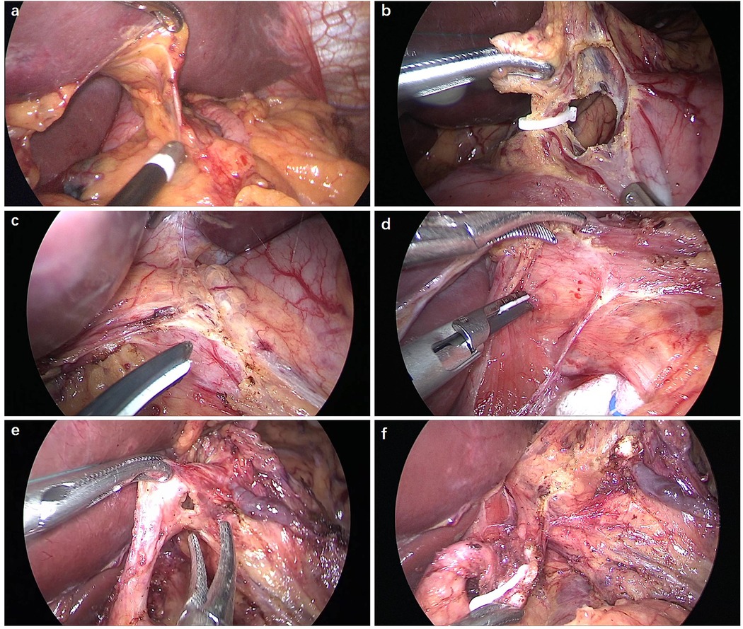 Figure 1. Preservation of hepatic branches and celiac branches. (a) The hepatogastric ligament was separated below the hepatic division to retain the hepatic branches. (b) The second branch of the right gastric artery was dissected. (c) The front of the abdominal oesophagus was exposed. (d) The posterior vagus nerve trunk was excised between the oesophagus and diaphragmatic crus. (e) The left gastric artery was separated just distal to the celiac division junction and left gastric artery to preserve the celiac branches. (f) The lymph node was dissected whilst preserving the celiac branches.