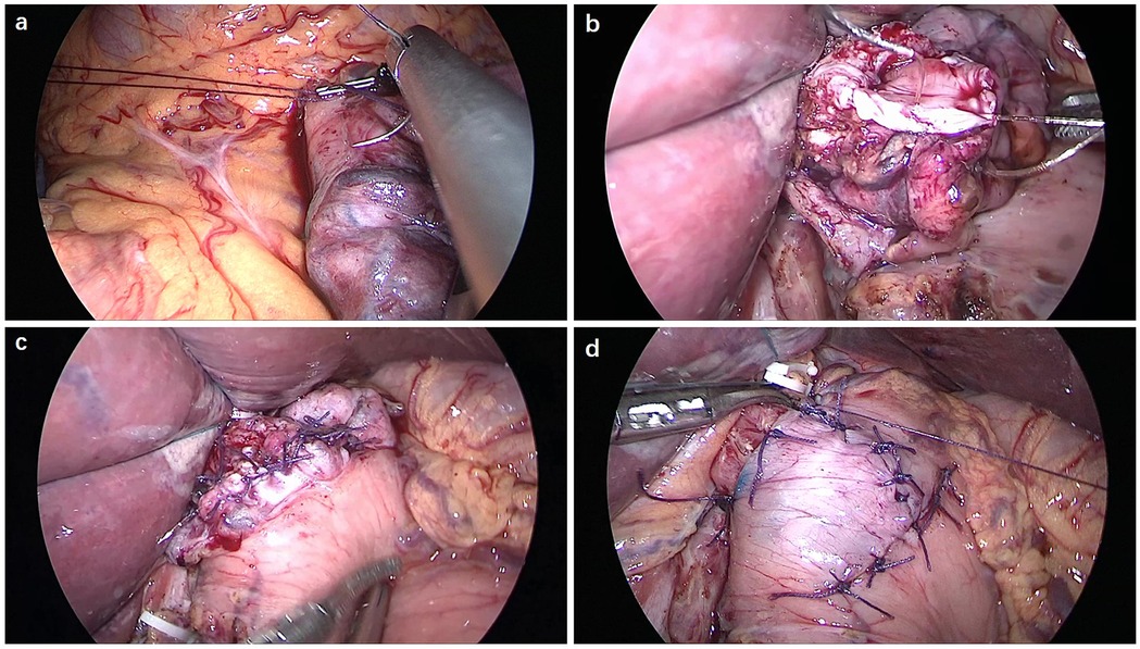 By making a further incision around 1–2 cm from the proximal resection stump, a seromuscular double-flap (2.5 cm × 3.5 cm) was created on the front surface of the remaining stomach. The connective tissue between the muscle and the mucosa was cut under proper tension. The gastric mucosa was exposed for anastomosis, keeping a 1 cm gap from the lower flap end. Anastomotic stricture was prevented by keeping this gap slightly greater than the width of the oesophagus. At the flap's upper edge, the posterior side of the oesophagus was attached to the remaining stomach using three-point sutures (Figure 2a). Hand sewing method was used to anastomosize the oesophagus to the stomach remnant using a V-Loc suture (Figure 2b). For the posterior wall, a continuous single-layer suture was used between all layers of the oesophagus and gastric mucosa. The anterior wall was sutured using a layer-to-layer technique, with one continuous suture connecting the oesophagus and stomach mucosa, and another interrupted suture connecting the stomach seromuscular and oesophageal muscular layers (Figure 2c). The Y-shaped flap was then secured in place along the midline to encompass the biggest feasible region of the anastomosis (Figure 2d).