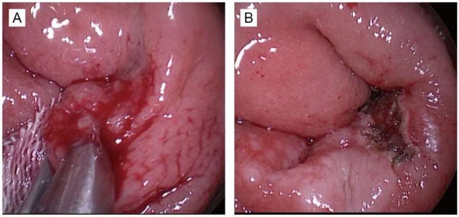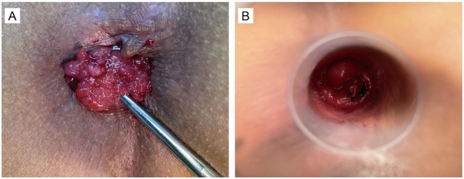 Patients in the treatment group received a combined procedure involving simplified transanal excision (sTE) and the Ruiyun procedure for hemorrhoids (RPH), designed to facilitate local tumor removal while preserving sphincter integrity. The RPH system was applied to deliver controlled negative pressure (0.08–0.1 MPa) to the tumor site, followed by elastic ligation. Once the lesion was securely ligated, it was excised. This method was developed to simplify the surgical workflow and minimize intraoperative bleeding and postoperative complications. All excised specimens were subsequently evaluated using routine histopathological and immunohistochemical techniques (Figures 2A,B).