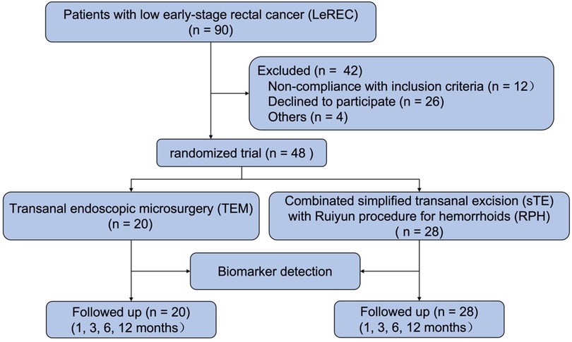 Between February 1, 2015, and December 31, 2019, a total of 90 eligible patients diagnosed with low early-stage rectal cancer (LeREC) were assessed for enrollment at Shenyang Coloproctology Hospital (Shenyang, China). Of these, 48 patients met the inclusion criteria and provided informed consent for participation in the randomized controlled trial, while 42 patients were excluded based on predefined exclusion criteria. A total of 20 patients were randomized to undergo transanal endoscopic microsurgery (TEM), and 28 patients were assigned to receive simplified transanal excision (sTE) combined with Ruiyun procedure for hemorrhoids (RPH) (Figure 3).