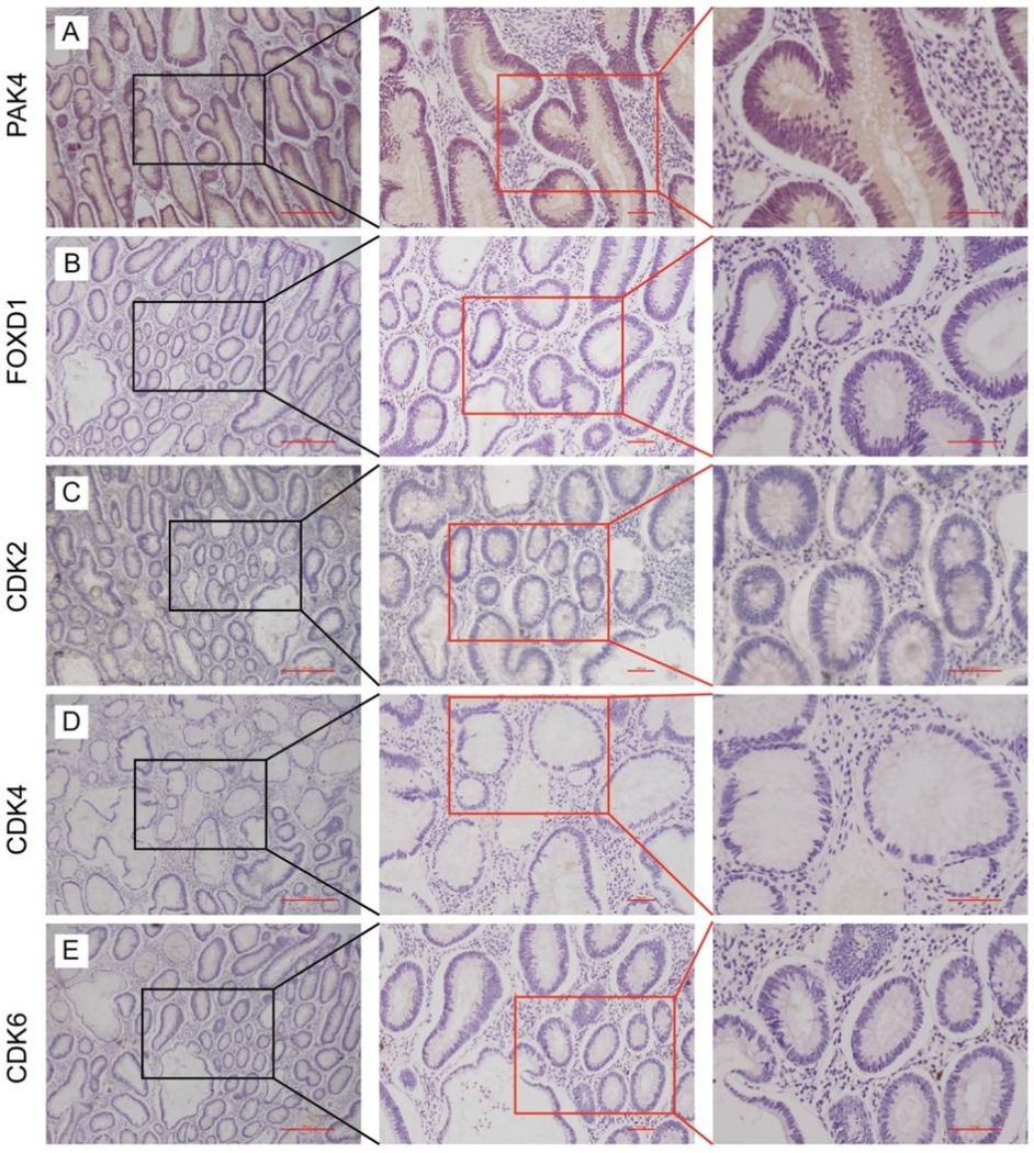 Figure 4. Expression of PAK4 (A), FOXD1 (B), CDK2 (C), CDK4 (D), and CDK6 (E) in low early-stage rectal cancers by using immunohistochemistry analysis.
