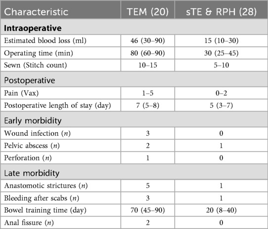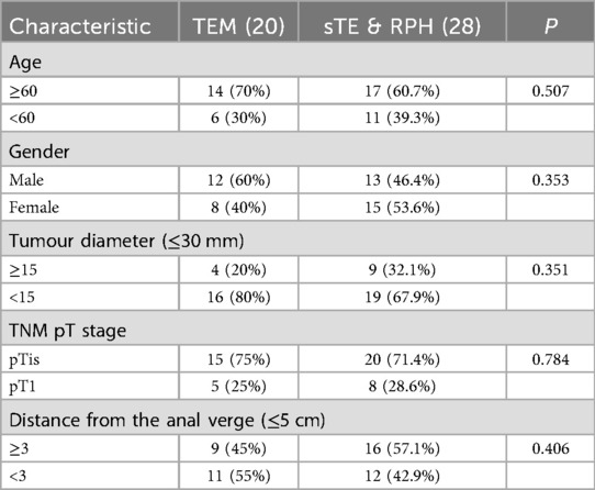 Table 2. Intraoperative and postoperative characteristics of lower two-thirds of early-stage rectal cancer patients who underwent TEM surgery or sTE & RPH surgery.