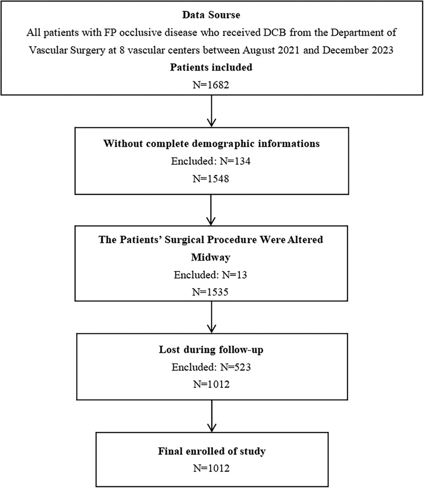 Patients diagnosed with FP occlusive disease who received DCB treatment were chosen using a convenience sampling method and were admitted to the Department of Vascular Surgery at 8 vascular centers in China between August 2021 and December 2023. The study data were authorized by the respective hospital. The types of variables included in the study were systematically collected across all centers. The surgical techniques employed across all centers are standardized, which were vascular interventions, including DCB, Debulking procedures, and stent implantation when necessary.