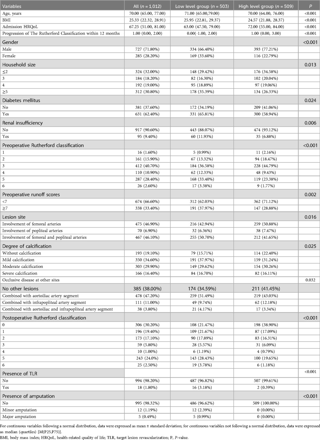 According to the established criteria for inclusion and exclusion, this study encompassed 1,012 patients diagnosed with FP occlusive disease, comprising 727 males (71.8%) and 285 females (28.2%), as shown in Figure 1. The median HRQoL score at 12 months following treatment with DCB was 141. Those with scores below 141 were classified as the low HRQoL group, comprising 503 patients (49.70%), while those with scores of 141 or higher were classified as having a high HRQoL group, comprising 509 (50.30%). The HRQoL scores at 12 months postoperatively served as a binary dependent variable. A detailed comparison of the patients’ characteristics was shown in Supplementary Table S1.